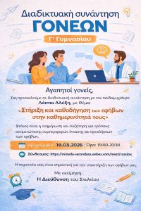 Ευχαριστούμε θερμά τον κ. Λάππα για την ουσιαστική καθοδήγησή του κατά τη διάρκεια της τηλεδιάσκεψης που πραγματοποιήθηκε τη Δευτέρα 16/3/2026 με θέμα την ενδυνάμωση των εφήβων. Η εκδήλωση πραγματοποιήθηκε παρουσία της Διεύθυνσης του ΠΣΠΘ, του Συλλόγου Διδασκόντων του Σχολείου και των γονέων/κηδεμόνων των μαθητών/τριών της γ γυμνασίου.