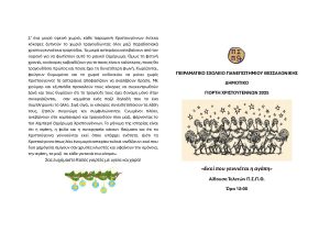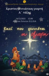 Στις 14/12/2025 οι μαθητές και οι μαθήτριες της Α΄ τάξης παρουσίασαν στην Αίθουσα Τελετών του Π.Σ.Π.Θ. το μουσικοθεατρικό δρώμενο: «Εκεί που γεννιέται η αγάπη», ένα αλληγορικό δρώμενο για την σημασία της συνεργασίας σε μια κοινότητα. Η δράση εντάσσεται ενότητα των Εργαστηρίων Δεξιοτήτων για την αλληλεγγύη και την σχολική διαμεσολάβηση .